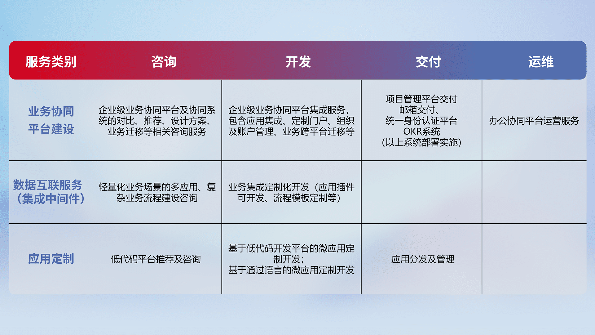 针对钉钉、、、企微、、、IDaas等平台级产品提供产品的规划、、、、方案、、、交付、、、定制化开发等服务,,实现如统一协同办公、、、、智能客户服务、、混合会议管理、、智能数据查询、、、等业务场景,,,,实现数字化转型。。。。