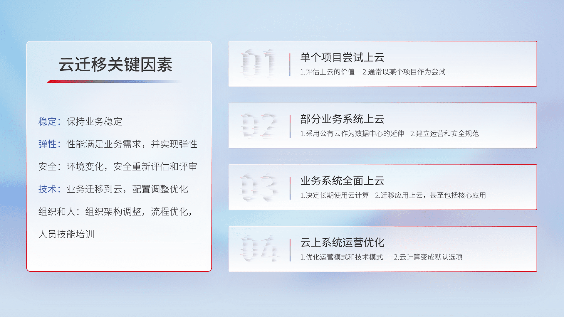 结合实际业务,,从规划设计、、、、云平台选型、、云原生改造、、、、数据迁移、、集成交付,,迁移全过程为客户识别最佳上云路径,,,,做好风险识别管理,,设计网络架构、、、身份权限、、、安全审计合规、、、操作审计、、、日志审计、、监控告警策略、、、、多站点容灾设计等,,,对云上基础设施进行整体规划,,,,提升IT治理水平,,,以满足弹性、、高可用、、、、高性能的需求。。